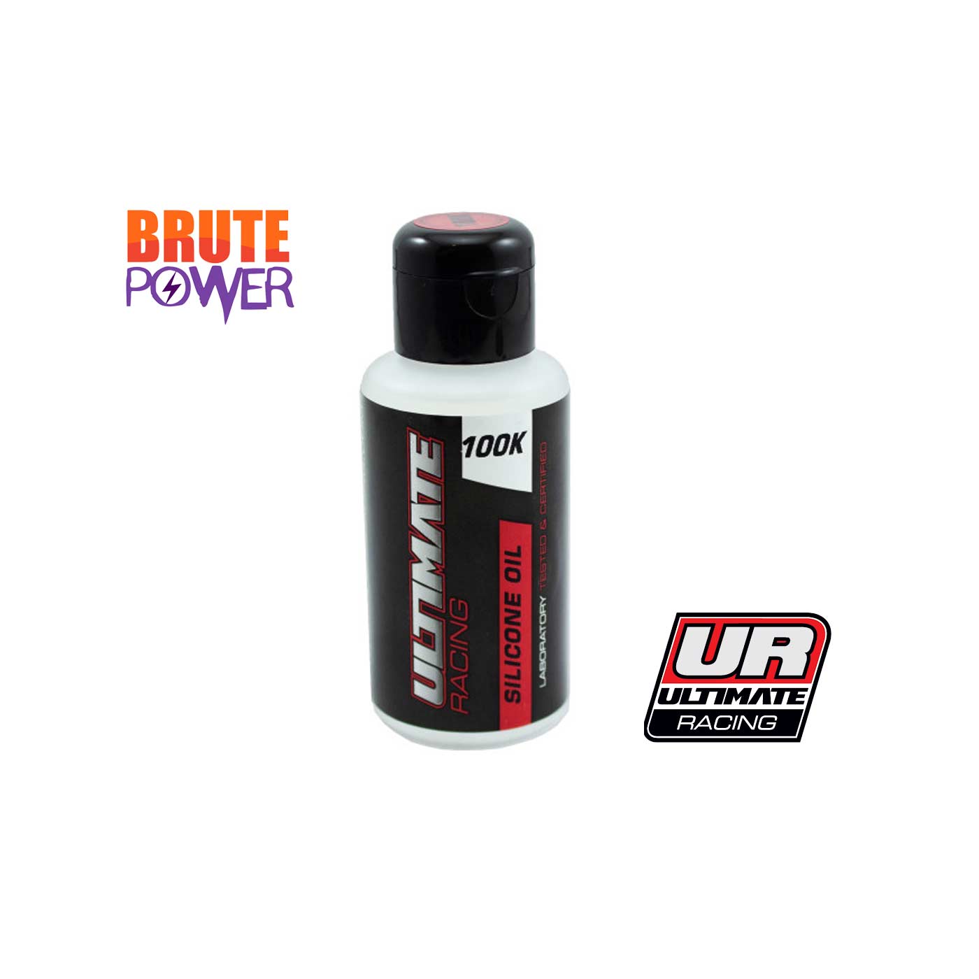 Botella de 75 ml de aceite de silicona para diferenciales de 100.000 CPS de Ultimate Racing. El aceite de diferencial Ultimate Racing esta fabricado con 100% pura silicona para ofrecer un rendimiento estable a cualquier temperatura de trabajo retrasando la fatiga de los diferenciales. La graduación de las siliconas es en Cst y como mayor es el número del artículo mas densidad tiene. También contiene aditivos antifricción que minimizan la fricción y así el desgaste de los piñones del diferencial.