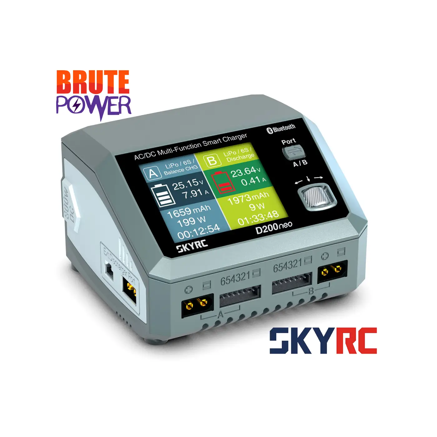 Debido a sus dos entradas independientes, el cargador se puede utilizar para diversas situaciones de carga. También tiene una interfaz particularmente fácil de usar y funciones potentes que se adoptaron directamente del T1000. Por ejemplo, la unidad de descarga BD350 se puede conectar para aumentar significativamente el rendimiento de descarga. La nueva apariencia y el control mejorado del botón de desplazamiento hacen que la carga sea más cómoda y sencilla en general. Por supuesto, el D200 neo también está equipado con el control de la aplicación “SkyCharger” y una interfaz para el software Charger Master para Windows/Mac OS, lo que permite una mayor libertad de programación e información detallada durante la carga o descarga.