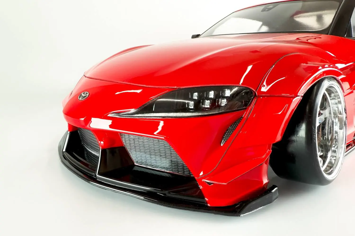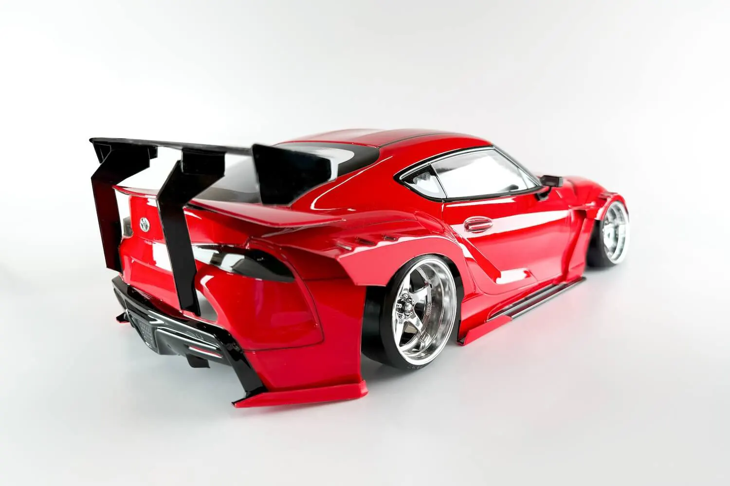 Para reproducir el perfil ancho y bajo del coche real, el conjunto separa carrocería, paragolpes delantero y trasero. Incluye canards, alerón GT, espejos FLEX GT (Type-B) y pegatinas 3D, logrando una presencia de competición lista para destacar tanto en pista como en exposición. Es una carrocería de policarbonato sin pintar, preensamblada, con líneas limpias y proporciones fieles al original.