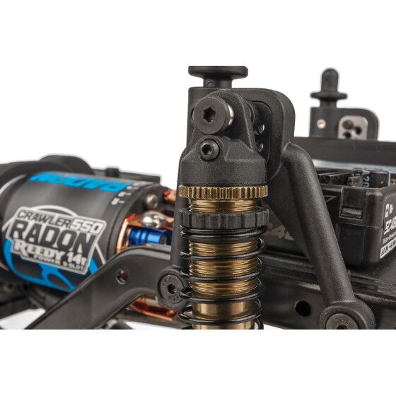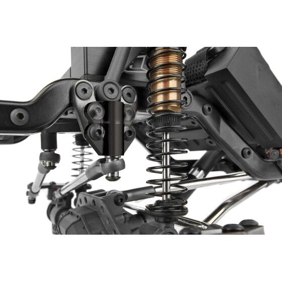 Hemos actualizado el Builder’s Kit una vez más, incluyendo nuestras torres de amortiguador GKS™ en la parte delantera y trasera. Nuestros insertos para montajes de amortiguadores permiten ajustar el ángulo de los amortiguadores, la caída y la altura del vehículo sin afectar la precarga del muelle. Emparejados con los insertos de montaje de los amortiguadores, se incluyen los amortiguadores Factory Team de bronce ultralisos, con tapas y collares de plástico negro, perfectos para atravesar terrenos difíciles. Junto con las torres de amortiguadores actualizadas, hemos añadido el soporte de barra estabilizadora GKS de aluminio que se fija directamente a los rieles del chasis, lo que hace que la suspensión delantera sea más rígida y libre de flexión, proporcionando una sensación de dirección más precisa. También se incluyen los enlaces de alta altura con distancias de entre ejes de 12.3” y 12.8” con acabado negro nitrurado y bolas de pivote de acero Factory Team para una articulación más suave.