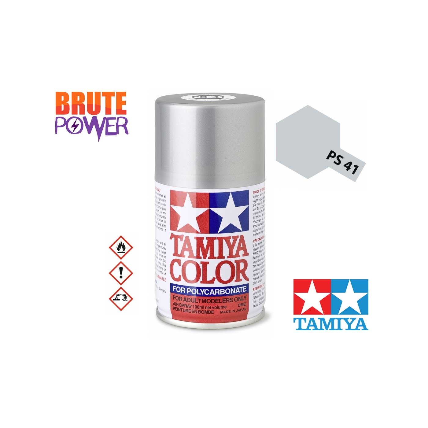 Spray pintura color plata brillante PS-41 ref 86041 de la marca Tamiya para Policarbonato, adecuado para carrocerías de Lexan.