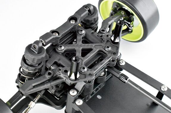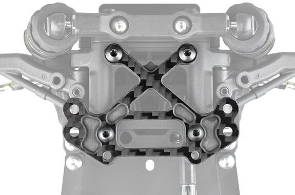 También se preparan orificios de montaje de postes de carrocería en ambos lados del refuerzo superior. Al reubicar el poste de la carrocería desde el borde del chasis, se logra una reducción de peso en la sección delantera y se obtiene un manejo más ágil. ¡Prueba el refuerzo superior delantero de carbono para RDX, que mejora la estabilidad durante el drifting con una rigidez frontal abrumadora!