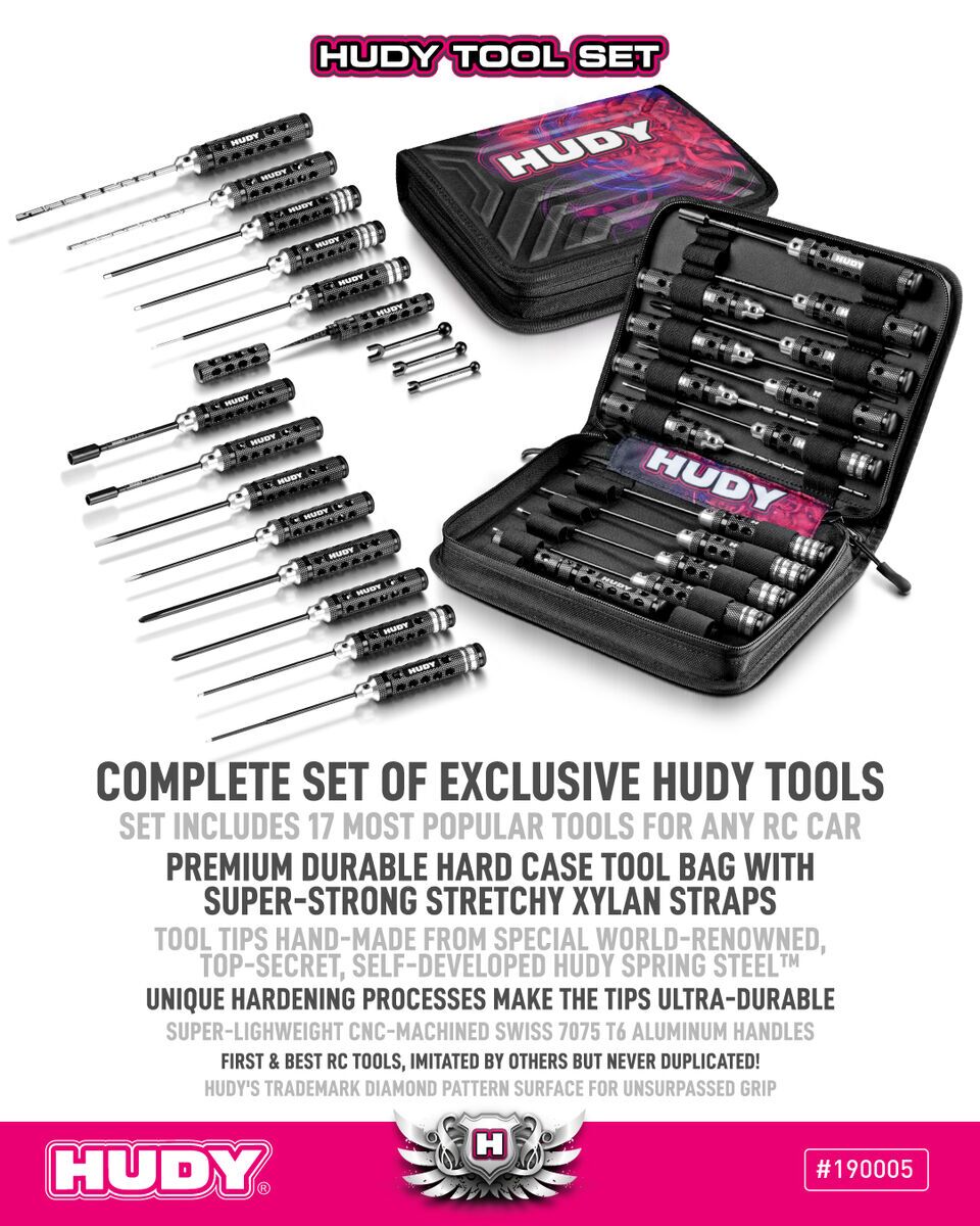 Set de herramientas Hudy de edición limitada con 18 piezas esenciales para mantenimiento de coches R/C. Incluye una bolsa de transporte de alta calidad, diseño moderno y capacidad para 30 herramientas. Fabricado con materiales europeos premium y sistema de sujeción elástico duradero. Ideal para uso profesional o aficionado.