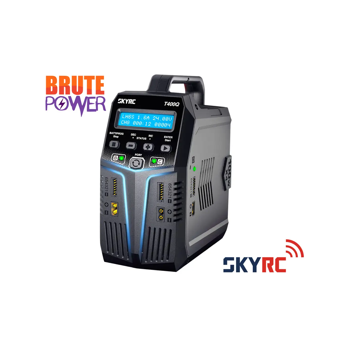 El SkyRC T400Q ofrece carga y descarga fáciles de usar de los tipos de batería más comunes (LiPo, LiFe, LiIon, LiHV, NiMH, NiCd, Pb) en el diseño de torre simple y delgado habitual. Este dispositivo AC/DC gestiona un total de 100W a 12A en sus cuatro salidas independientes, es decir, un total de 400W.