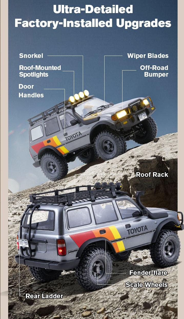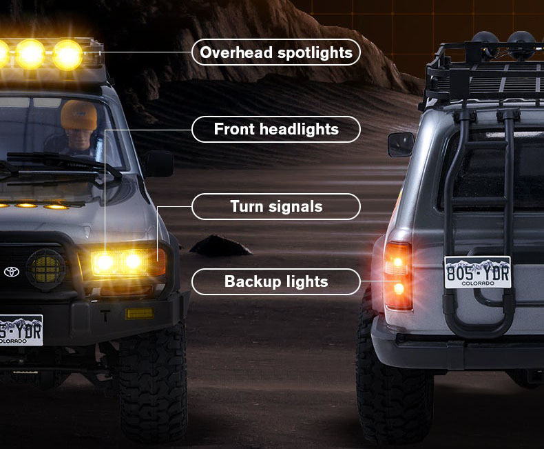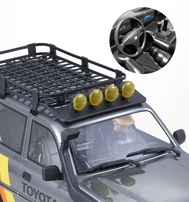 Con carrocería de policarbonato resistente y acabados de alta calidad, este crawler a escala 1/10 reproduce con precisión el mítico Toyota Land Cruiser 80. Incluye retrovisores integrados, baca de techo con faros LED, escalera trasera y un interior detallado con figura de conductor y salpicadero realista. Gracias a su sistema de luces magnéticas, podrás activar faros, intermitentes y luces traseras desde el mando.